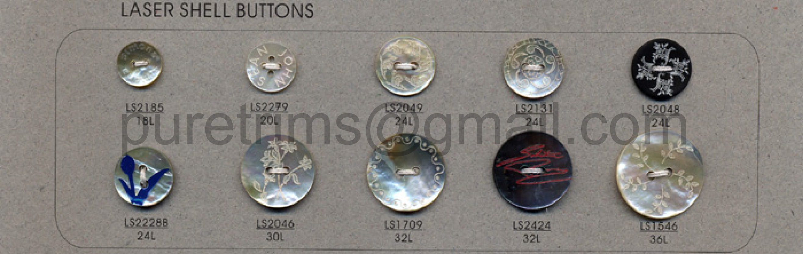 We specialize in making buttons of precious shells, such as Mother of Pearl, Trocas, Agoya, Rivershell, Abalone and etc.  Can be DTM.