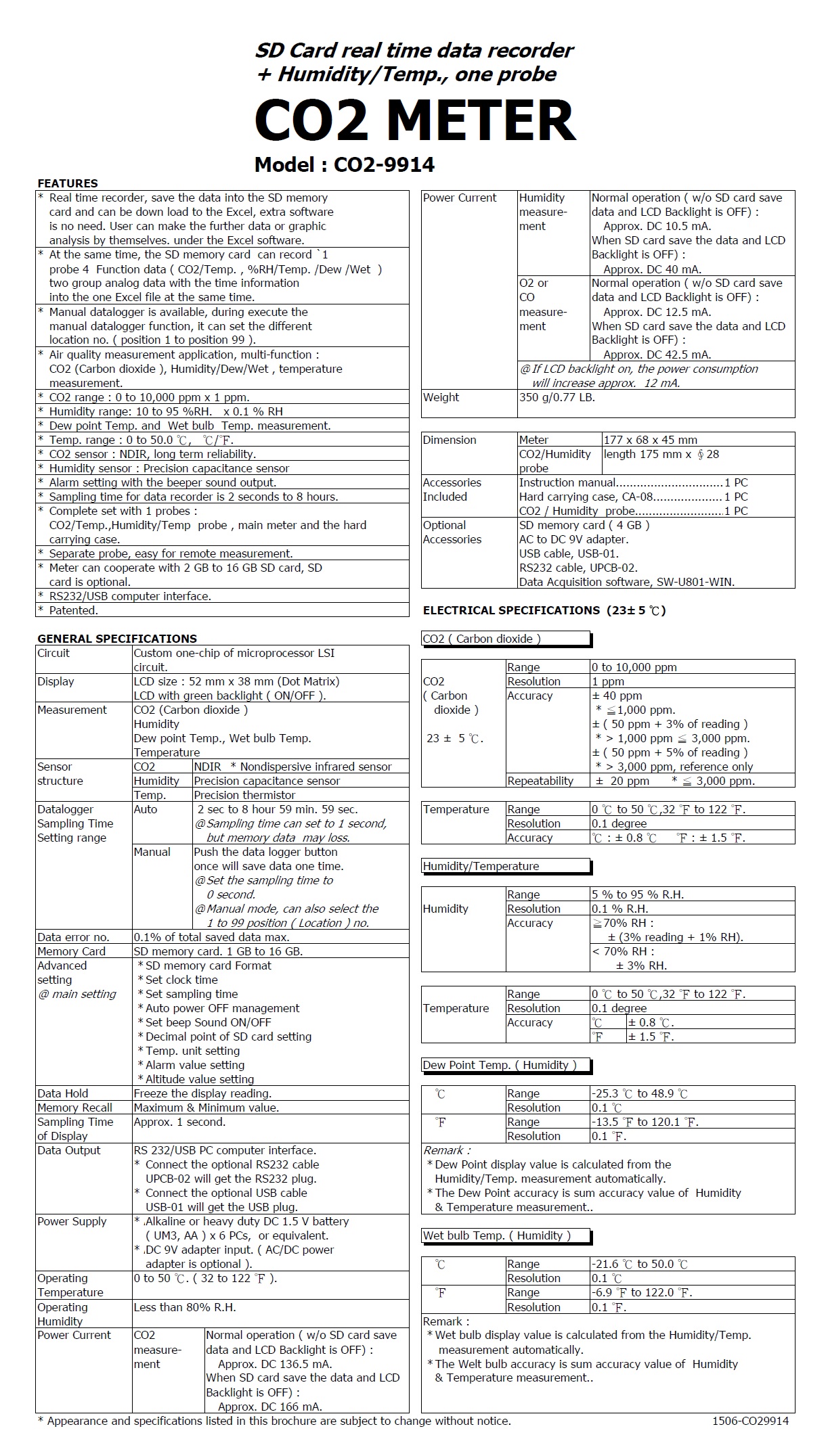 Product Name : | CO2 METER + Humidity/Temp., one probe Model : CO2-9914SD 記憶式二氧化碳檢測儀+露點+溫濕度計 |