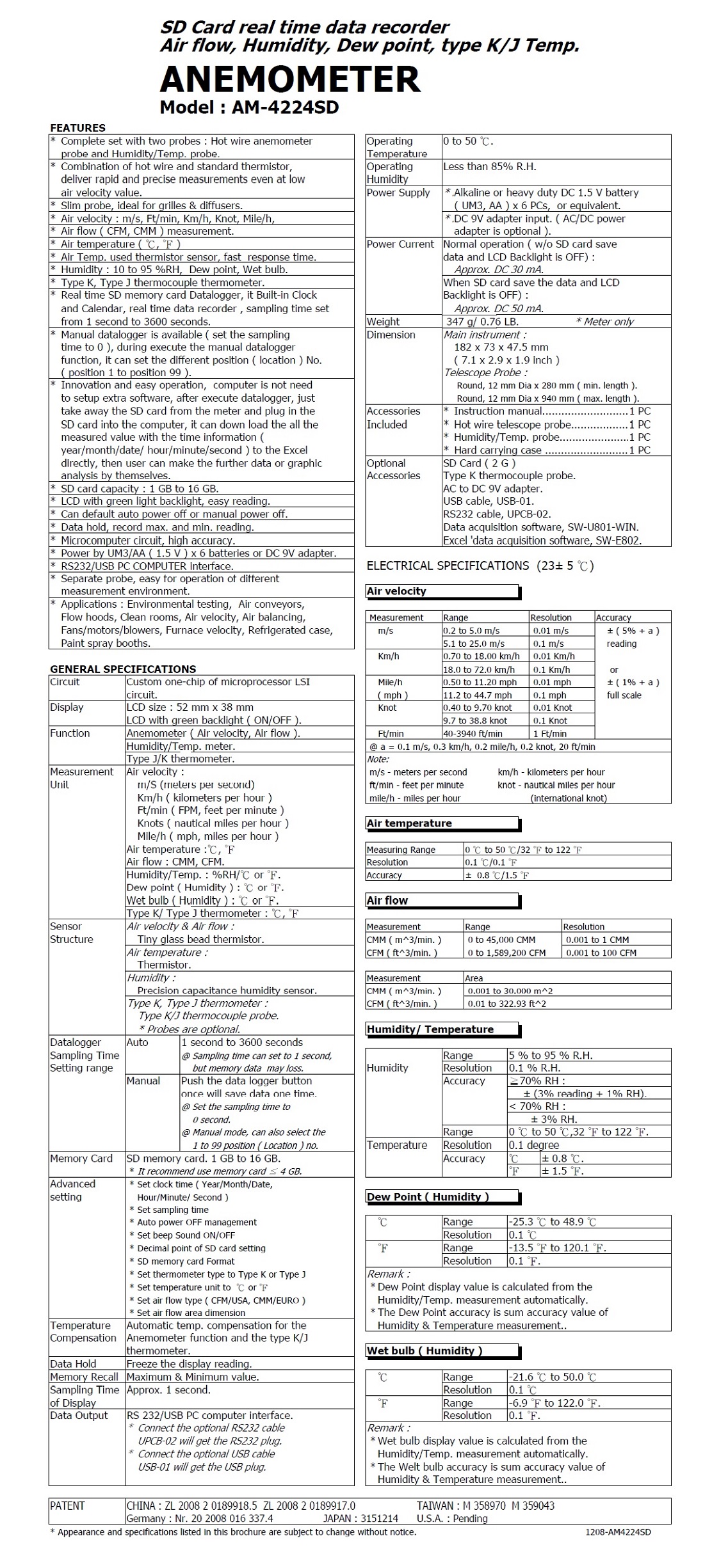 HOT WIRE ANEMOMETER 記憶式熱風速, 濕度, 露點, 溫度計