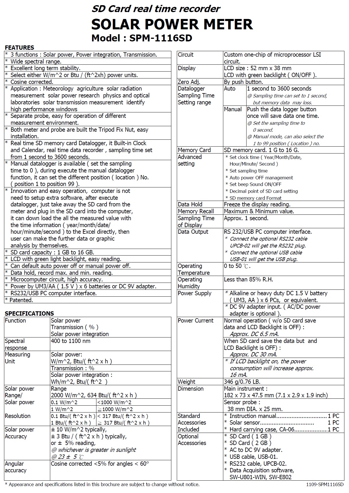 Product Name : | SOLAR POWER METER Model : SPM-1116SD 記憶式太陽能功率計 |