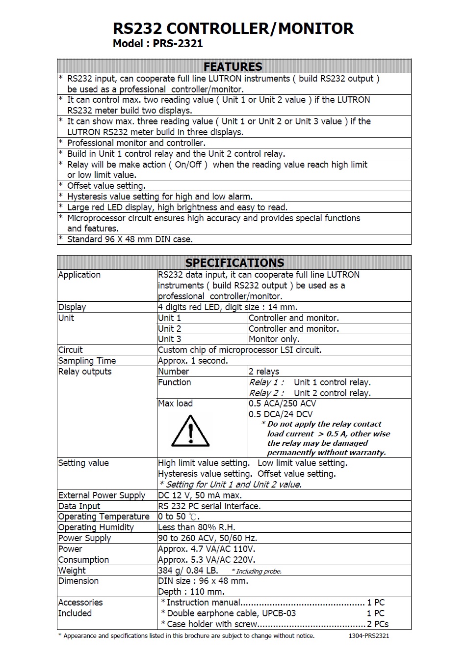 Product Name : RS232 CONTROLLER/MONITOR Model : PRS-2321 - RS232 控制顯示錶 (LUTRON儀器用)