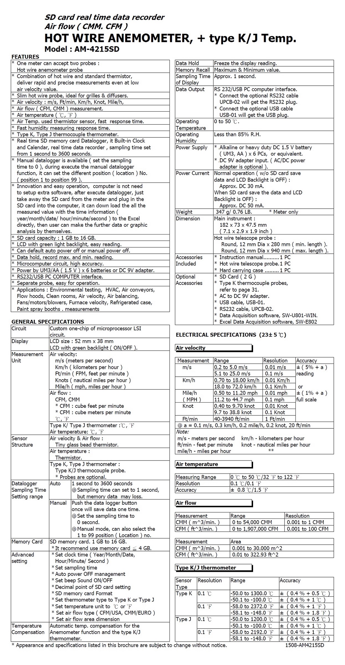 Product Name : | HOT WIRE ANEMOMETER Model : AM-4215SD 記憶式熱風速 溫度計 |