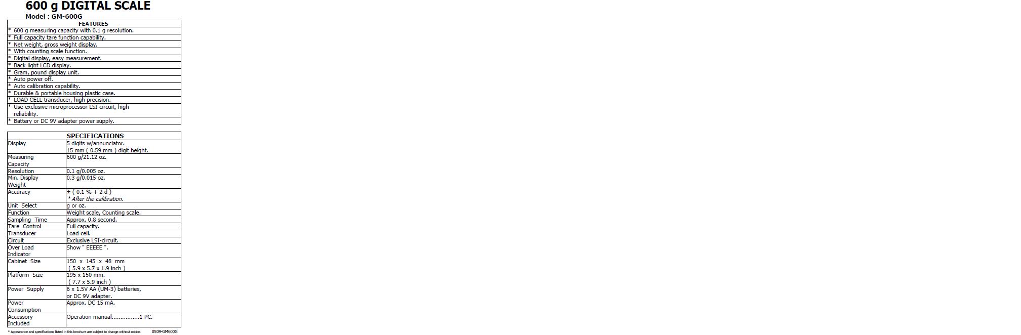 * Capacity : 600 g x 0.1 g