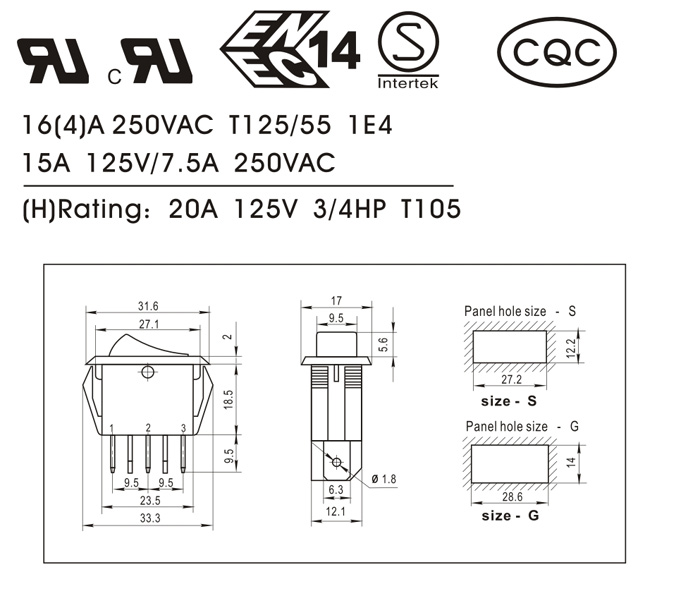 (H): 20A 125VAC 3/4HP T105